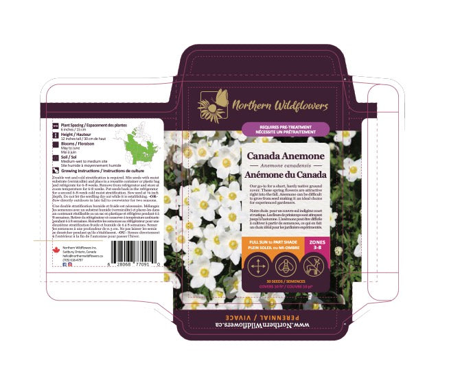 Notez que, comme beaucoup d'autres plantes des bois, l'anémone du Canada peut être difficile à faire germer à partir de semences. Cette espèce nécessite une double dormance, ou une double stratification humide froide. Lorsqu'elle est plantée à l'automne, la plante peut nécessiter 2 saisons pour germer, ou si la stratification est effectuée à l'intérieur, le cycle doit être suivi deux fois (voir ci-dessous).