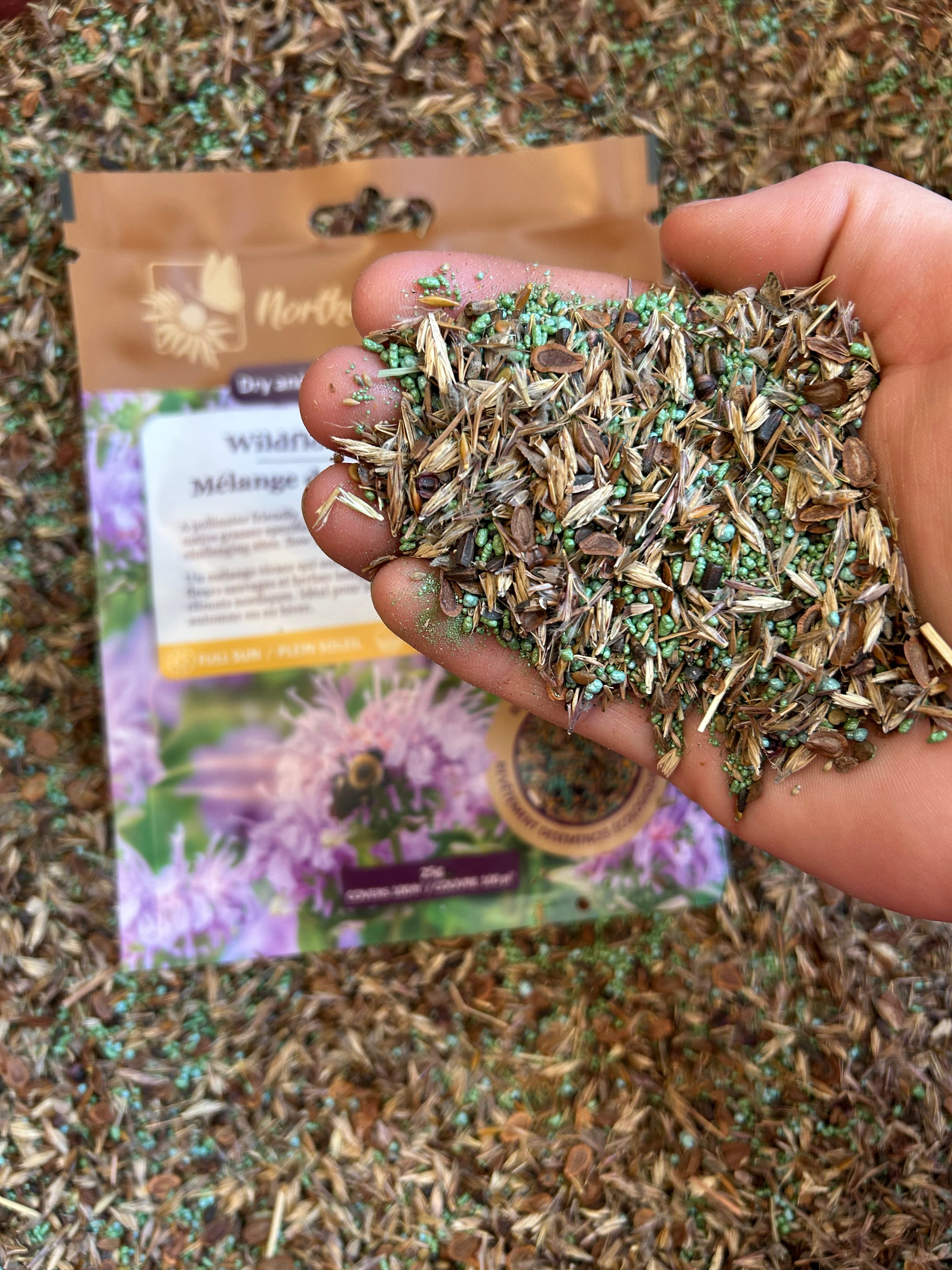 Nous avons enrobé les variétés à petites graines d'un mélange biodégradable de minéraux naturels pour faciliter l'application et augmenter les taux de germination.
